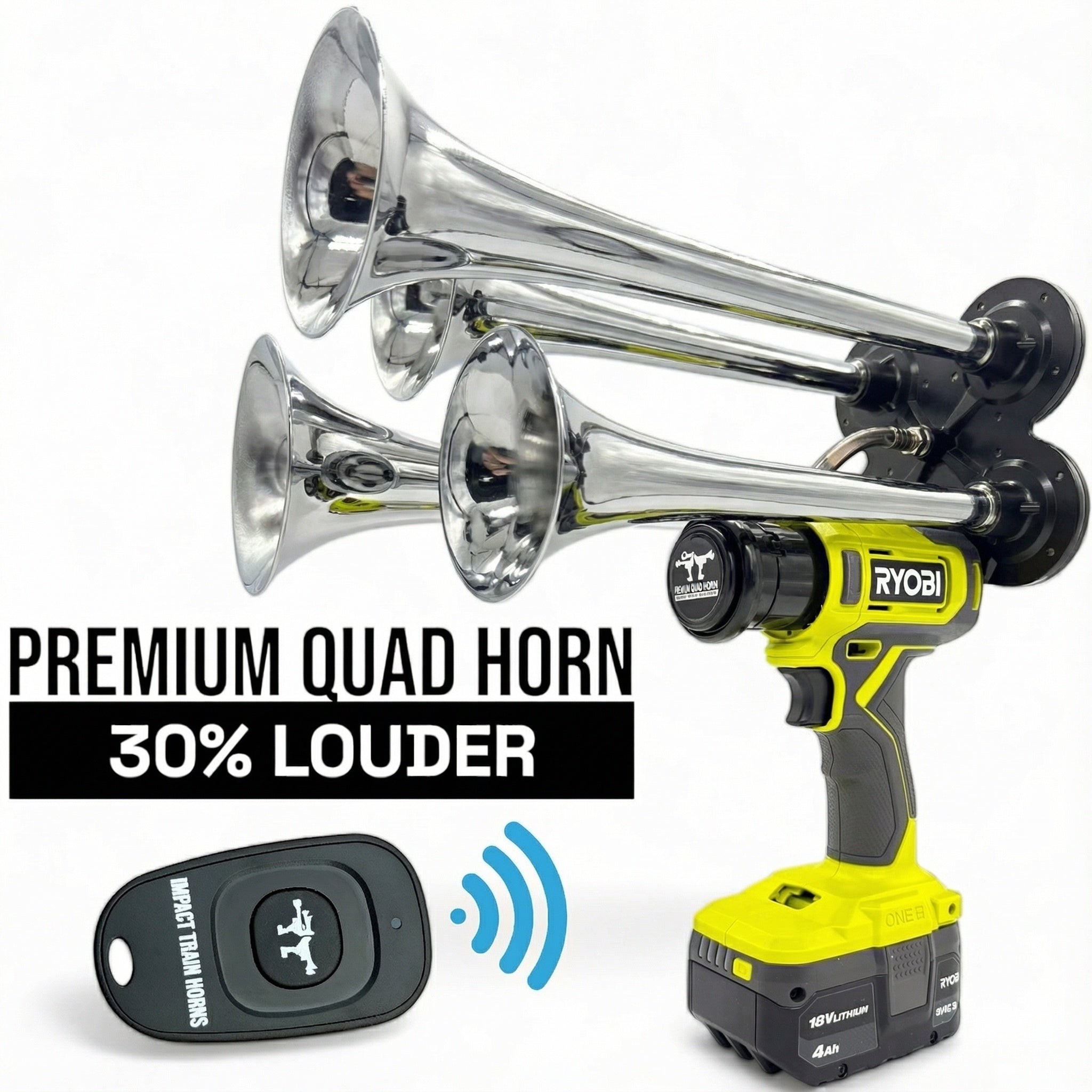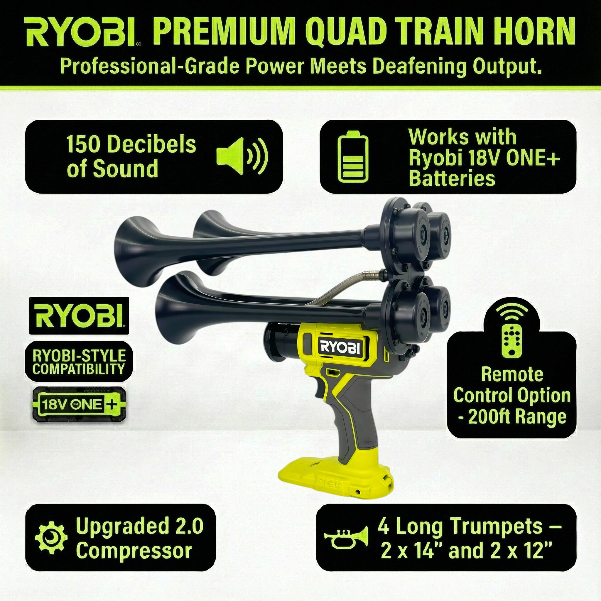 Get unmatched power and performance with the Premium Ryobi Air Horn. It features an upgraded horn base, 2.0 compressor, wireless remote control, and four long metal trumpets. This is the loudest train horn available.